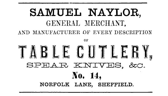Beyond the 1820s, following the various cutlery Naylors after Samuel Naylor is difficult. A Samuel Naylor was listed as a merchant in the 1830s (living in Springfield Place in 1833, and Glossop Road in 1837). Samuel Naylor, merchant, Furnival Lane, was listed in 1841 (moving to Eyre Street in 1845). He lived in Gloucester Road. In 1841, Samuel Naylor and Irving Van Wart dissolved their partnership as merchants and manufacturers in Sheffield and New York. In 1843, Samuel Naylor and William Sander....