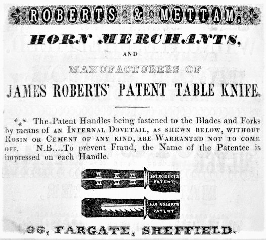 This enterprise was a horn, ivory, buck, and stag merchant, which specialised in horn pressing for cutlery handles (and umbrellas and whips). It can be traced to George Mettam, who was active as a horn presser in Hollis Croft by 1818 (when George Mettam & Son was listed). The son was apparently Samuel Mettam (c.1787-1870), who was born in Scholes, Rotherham. By 1822, Mettam, Roberts, & Mettam had been formed. George Mettam, Springfield, died on 13 December 1826 (aged 69) and was buried in St P....