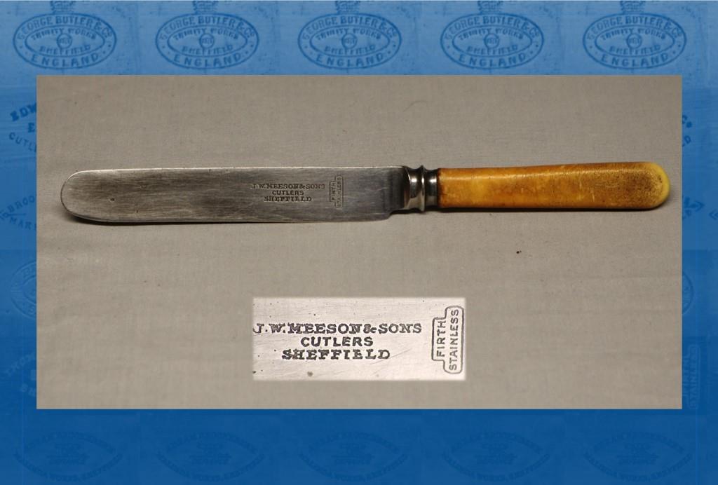 The Meeson family came from Gainsborough, Lincolnshire, and had settled in Sheffield by the mid-nineteenth century. In the Census (1851), Alfred Meeson was a watchman, living at George Lane with his wife, Eliza, and their sons. These included John William Meeson (c.1841-1919), who had been born in Hull. He had a varied career as a French polisher, then ivory cutter, before establishing himself in the 1890s as a cutlery manufacturer. His address was 143 Neill Road, which ran parallel to Ecclesall Road near Hunter’....
