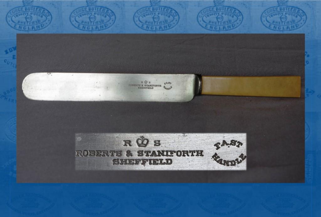 Roberts & Staniforth registered a silver mark in 1904. They were based at Wellington Street as an electroplate and cutlery manufacturer, but were not active after 1911. 'Roberts' has not been identified so far but the ‘Staniforth’ was John Wilkinson Staniforth (1855-1941), who lived at Hillsborough. His later career was as lessee of Recreation Hall, Hillsborough Bridge. He died on 26 March 1941, at Beechwood Avenue with effects valued at £561. ....