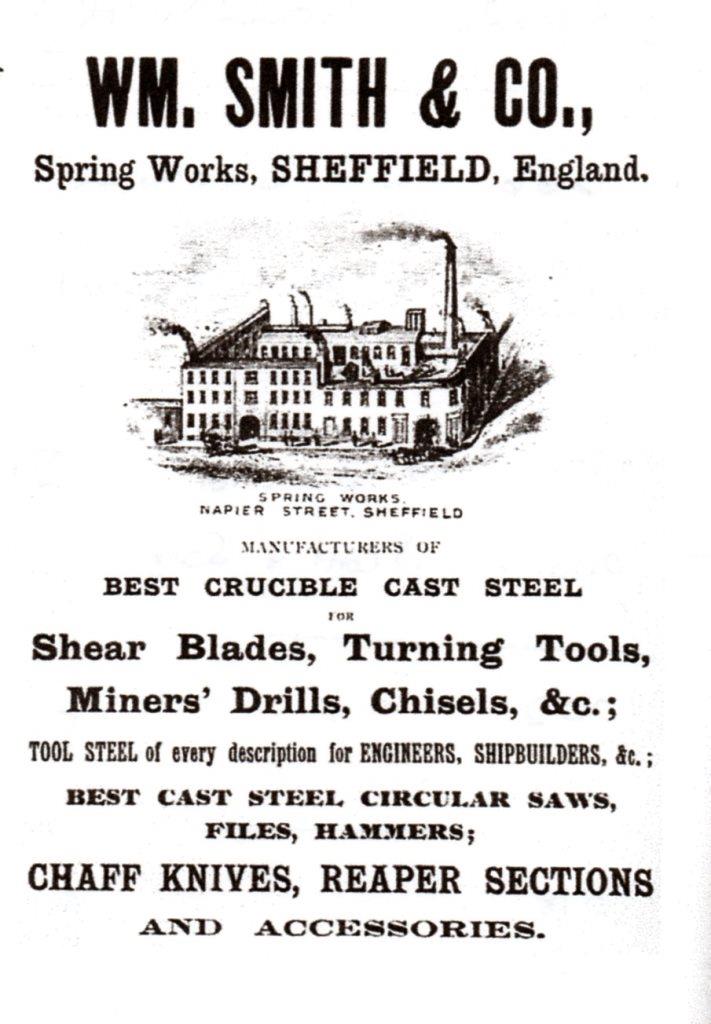 William Smith (1847 - 1915) was born at Knaresborough, possibly the son of Stephen (a police constable) and his wife, Mary. He worked as a merchant's clerk and then a commercial traveller.On 20 August 1887, The Sheffield Independent, advertised the sale of Spring Works at Napier Street / Renton Street, with its two / three storey block of workshops, warehouses and dwelling house (though apparently no steel furnace). In 1887. Smith, occupied the factory. In the 1890s, he advertised crucible cast steel circular saws, files....