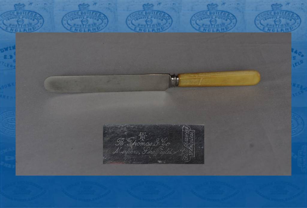 The ‘FIRTH-BREARLEY’ mark would suggest that this table knife was made in the interwar period. Frustratingly, a search of Sheffield directories has failed to reveal any mention of this firm. It may have been a company name used for trading purposes by Bernard Miller (b. 1902), who operated M. Bernard & Son Ltd at Rockingham Street/St Thomas Lane. Interestingly, B. Thomas & Co (Cutlers) Ltd, trading at 58 Rockingham Street, was registered in 1950 as a private company with £1,000 capital. The sub....