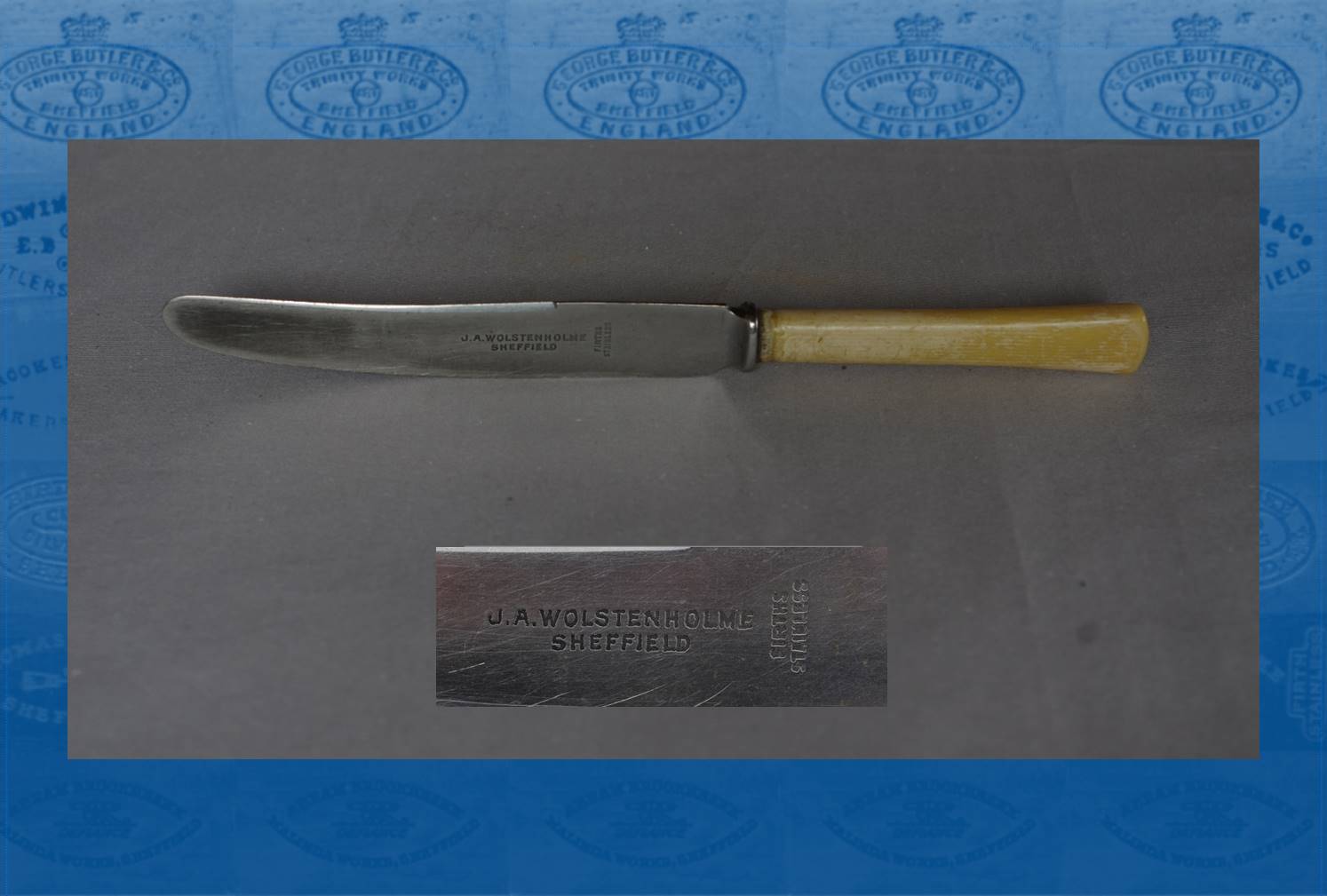 Wolstenholme was a relatively common name in the cutlery, electro-plate, and Britannia metal trades. Thus identifying this maker is difficult – not least, because there was more than one with the initials ‘J. A.’John Arthur Wolstenholme (1872-1947) might be a likely candidate. He was born in Sheffield, the son of John, a steel rod roller, and his wife, Ann. John Arthur became a commercial traveller in toys and fancy goods, who lived at Moor View Road, Woodseats, before the First World War. After 1918, he co....