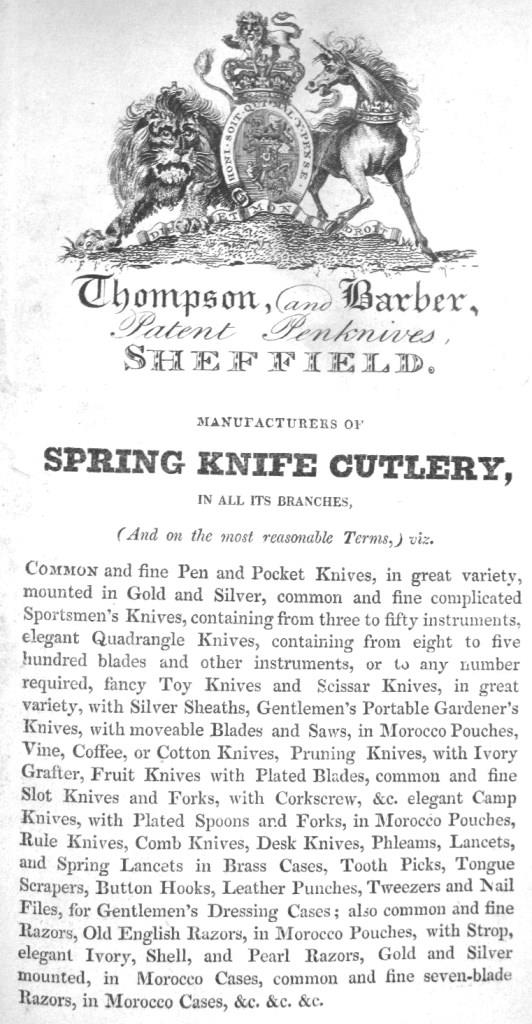 Listed in directories after 1811, Thompson & Barber made fine pen and pocket knives, razors, lancets and fleams in Charles Street. In the Sheffield Directory (1821) the firm placed a full-page advertisement, which listed a comprehensive range of spring knives (and other products, such as razors). On 1 May 1826, a selection of its products – alongside those of Sansom, Joseph Rodgers, and Crawshaw – was presented to the Duke of York by Master Cutler Henry Moorhouse to show that Sheffield made the be....
