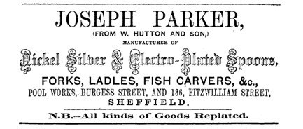 Joseph Parker (c.1829-1915), who was born at Harbourne, Staffordshire, started his electro-plate business in 1858 at Pool Works, Burgess Street.In the Census (1861), he was enumerated in Fitzwilliam Street with his wife Emma and three sons. He employed three girls. He advertised in 1860 and in 1862, when he highlighted his early experience with William Hutton. Between 1863 and 1872, his works address was Arundel Street. In 1872, the firm (with ‘& Sons’ added) relocated to Alexandra Electro Plate Works, ....