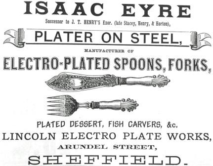 Born in Hayfield, Derbyshire, Isaac Eyre (1839-1893) was the son of Jonathan, an agricultural labourer, and his wife Grace. Apparently, Isaac’s first job was as a village police constable. In the 1860s, he moved to Sheffield and worked as a clerk. In 1869, he was the executor of James T. Henry (see J. T. Henry, and Stacey, Henry & Horton). Isaac Eyre assumed control of Henry’s firm, until the latter’s son came of age. J. T. Henry’s made fish carvers, fish eaters, dessert and vari....