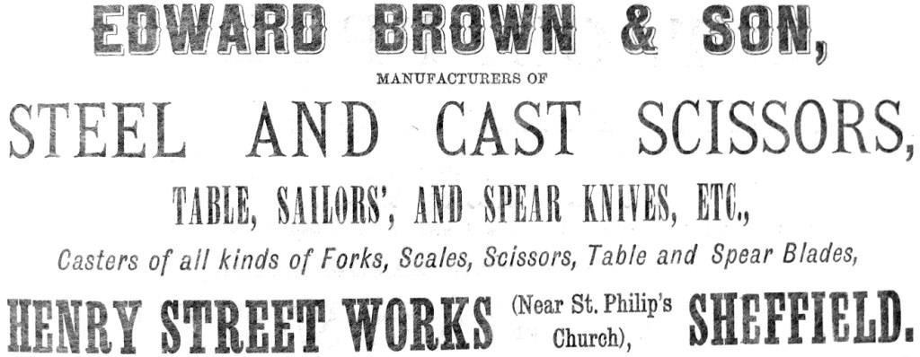 Directories stated that this firm was established in 1844. The founder was Edward Brown (c. 1821-1901), who by 1851 was a cast steel scissors manufacturer in Green Lane, employing 15 men and eight women. In 1858, he advertised from Henry Street. Edward’s son Edmund (born c. 1845) joined him. By 1865, Edward Brown & Son was manufacturing cast forks, scissors, and sailors’, table, and spear knives at Henry Street Works, Philadelphia. According to the Census (1871), the workforce was 29 men, three women, and thr....