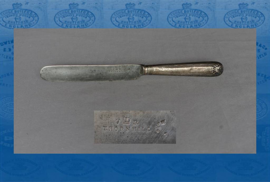 This Victorian metal-handled table knife is stamped ‘THORNHILL’, ‘LONDON’, with the Royal Cipher. It was probably made in Sheffield in about the 1890s. Thornhill’s traced its origins to 1734. Its address was New Bond Street, London, where it became a well-known retailer of cutlery and silverware. The owner, Walter Thornhill (1806-1887), had been born at Stoke Newington. He was stationer and rag merchant in the 1840s. In 1851, he was enumerate....