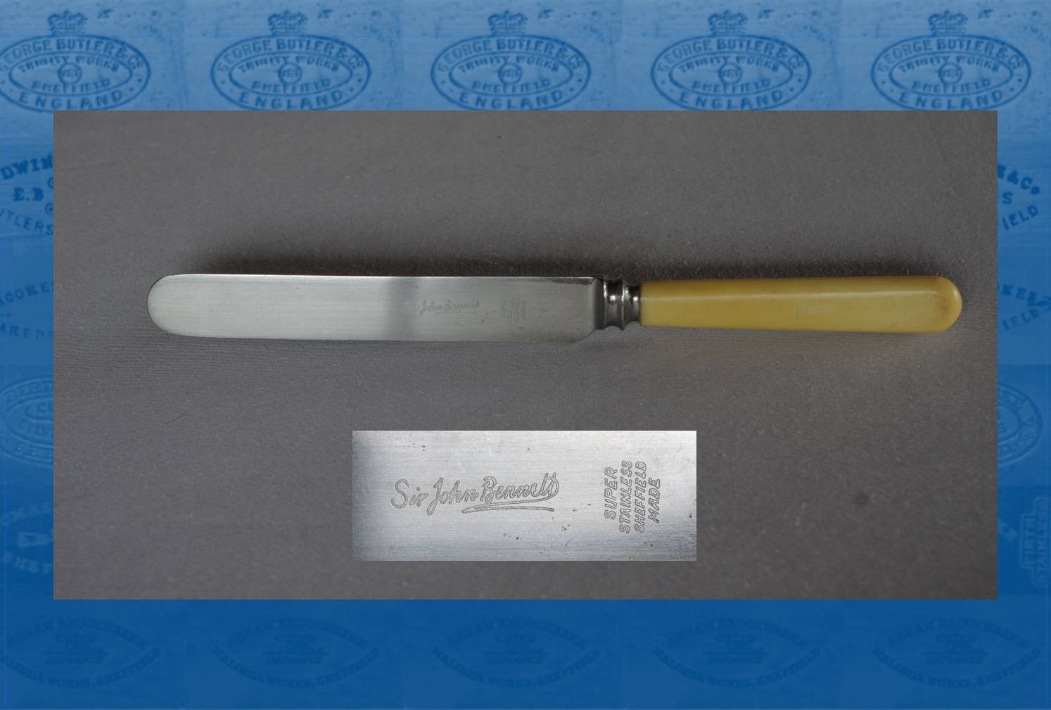 We believe this knife was made in Sheffield for Sir John Bennett Ltd, a London shop founded in 1889 to carry on the watchmaking business of Sir John Bennett (1814 - 1897), a watchmaker and "flamboyant personality" (see John Bennett (watchmaker) on Wikipedia). The maker is unknown.If you have any information about the knife or the maker, please share it with us via enquiries@hawleytoolcollection.com ....