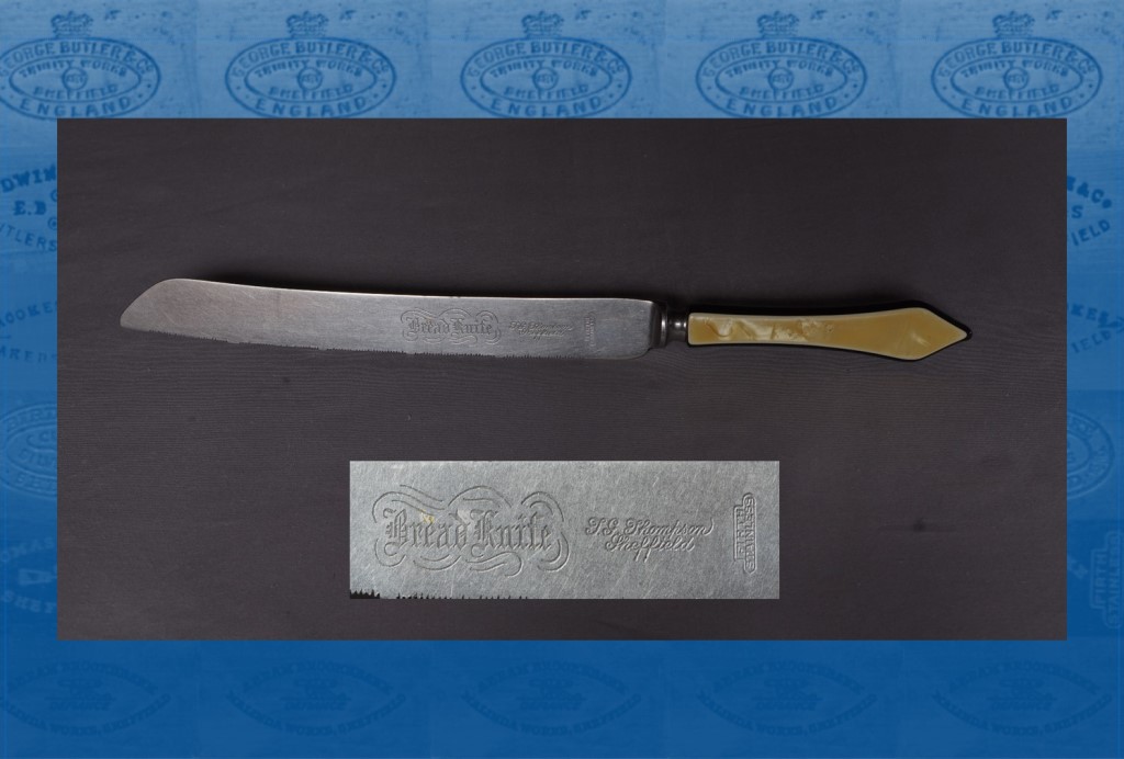 This knife is marked with the name of an ironmonger, Thomas George Thompson (1894-1953). He was born at Ashford in Kent and had moved to Sheffield by 1922, when he married Ethel Beal (1892-1958). By the 1930s, Thomas G. Thompson had set out his stall as an ironmonger and tool merchant at Norfolk Market Hall. On one occasion he advertised as the ‘Grate Man’, but his stall also had ‘a fine range of cutlery, including butchers’ cutlery, all Sheffield made, hand-forged, in fa....
