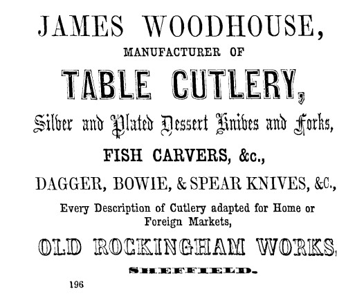 Table-knife manufacturer and merchant James Woodhouse (c. 1791-1851), New Church Street, was listed in the directory of 1828. In the 1830s, he moved to Rockingham Lane and was later at Old Rockingham Works, Rockingham Street. He died on 3 March 1851, aged 65, and was buried at Ecclesall. His widow, Mary Ann Woodhouse (1794-1880), inherited the business, which advertised in 1852 and 1856 as a manufacturer of silver and plated dessert knives and forks, daggers, Bowies, and spear-point knives. In 1858, t....