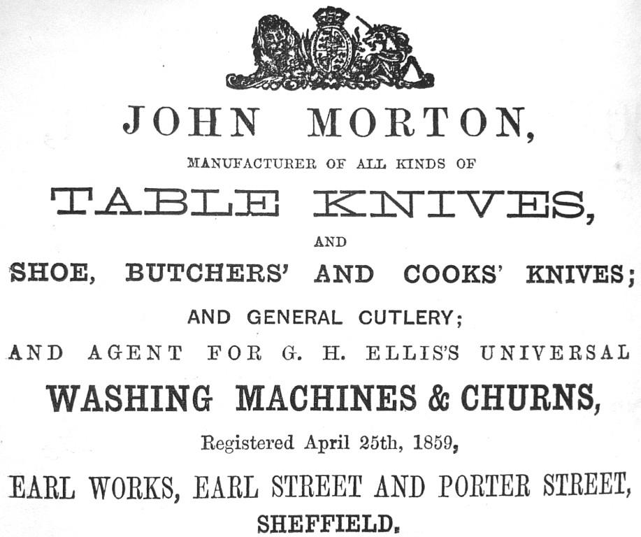 John Morton, table knife manufacturer, advertised in 1860 from Earl Works, Earl Street and Porter Street. Morton also advertised as agent for washing machines and churns. This was apparently John Morton, a table knife hafter, who was living in Earl Street when the Census was taken in 1851. Morton was listed in in Porter Street in 1861 (when his residential address in the Census had changed to Arundel Street). In 1862, John Morton was a manufacturer of table knives and razors at Mettam’s Works, H....