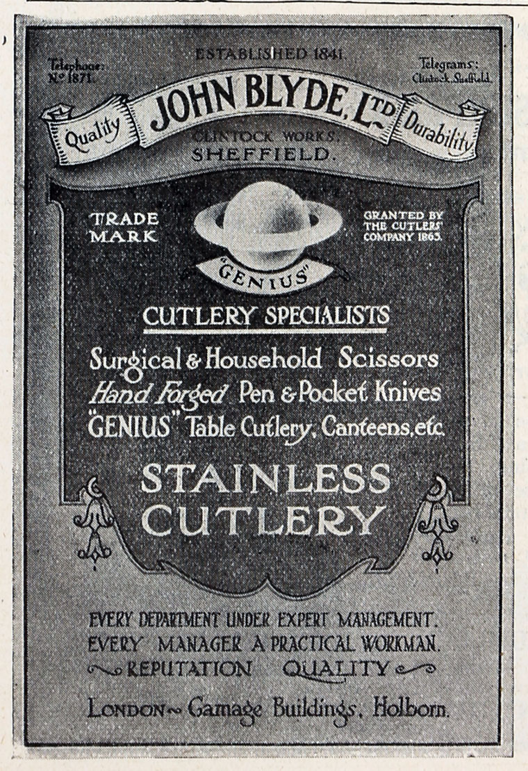 A start date of 1841 is recorded in the trade literature for this company. John Blyde (1828-1899), a Sheffield-born scissors and surgical instrument manufacturer, was baptised at a Methodist New Connexion Chapel. He was the son of James Blyde, scissorsmith, and his wife, Caroline, the daughter of George Gregory of Norton. The Blyde family business had been launched by John’s father. Between 1851 and 1857, it operated as James Blyde & Son, with John as the ‘son’ in the busin....