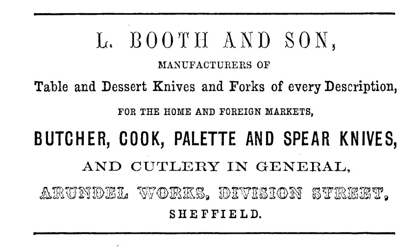 Luke Booth was listed as a manufacturer of table, butchers’, cooks’, and palette knives in Norfolk Street in 1845, with a house in Leadmill Street. Booth also made Bowie knives. In the early 1850s, Booth’s operations were in Arundel Street, with his home in Shrewsbury Road. Luke Booth, ‘merchant and manufacturer’, died on 7 May 1855, aged 64, and was buried in the General Cemetery’s unconsecrated ground. The business continued as Luke Booth & Son, under John Car....