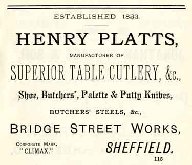 The directory for 1863 has an advertisement for Henry Platts, as a manufacturer of ‘superior’ table cutlery, shoe, butchers’, palette, and putty-knives. He was based at Excelsior Works in Suffolk Street and lived in Birkendale View, Upperthorpe. He appears to have launched his business as a cutlery dealer in South Street in 1853, before moving to Suffolk Street in the early 1860s. In 1861, he employed a dozen men and one boy. By the 1870s, the business had moved to Stand Cutlery Works....