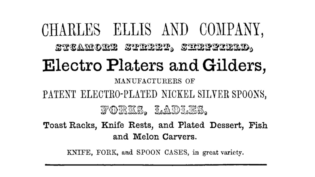 Born in Sheffield in 1828, Charles Ellis was the son of Isaac Ellis, a table knife cutler in Hollis Croft, and his wife Mary. By 1854, he was based in Norfolk Street/Sycamore Street as a spoon and fork manufacturer. In the 1860s, his products (which later included knives) were electro-plated. Presumably, it was a small business and not until 1893 did Ellis register a silver mark (CE & Co) from Norfolk Street. He died, aged 71, at Beech Hill Road on 16 April 1899. He was buried in Ecclesall, ....