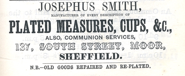 Josephus Smith (bapt. 21 August 1797) was the son of Benjamin Smith and his wife, Martha. After 1816, Benjamin was listed as a silver and plated ware manufacturer in South Street. He died on 27 July 1832. His son continued the South Street business, making silver and plated measures and table knives. Josephus registered a silver mark (‘J.S’) in 1846. He died on 11 December 1856, aged 58, and was buried in the General Cemetery. His sister, Marcia, had married Joseph Towndr....