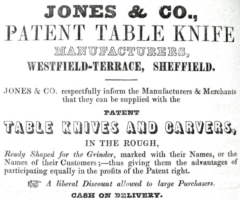John Jones (c.1799-1856) was born in London. In 1839, when he was based in Westfield Terrace, Sheffield, he patented an ‘improved’ table knife. He described it as ‘decidedly the greatest improvement which for upwards of three centuries has been made in this article’. Because dinner dishes were concave and the cutting edge of the traditional blade was straight, Jones reasoned that this meant that only the point of the blade was in contact with the meat. His solution was to chang....
