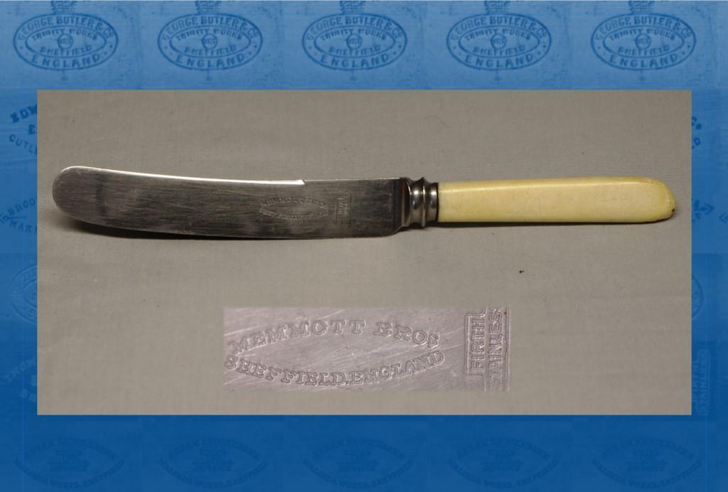 This family appeared in the Sheffield directory (1787) as manufacturers of pocket knives in Heeley. The cutlers were: Amos Memmott (trade mark ‘Y’ and reversed ‘G’); George Memmott (trade mark ‘M’, ‘G’, and dagger device); and Samuel Memmott (trade mark ‘RUSO’).Walter George Memmott (1845-1892) was the son of William Memmott and his wife Ann. Walter’s father was a saw maker in Arundel Lane, but he was trained as a silver finisher (later working as a spoo....