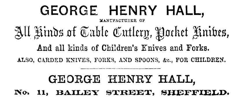George Henry Hall was born in Sheffield in about 1821. In the Census (1851), he was enumerated as a table knife hafter, living in Forge Lane with his wife, Sarah. In 1861, he advertised table cutlery, pocket knives, and children’s knives and forks from Bailey Street. In 1868, his works address was Holly Street and he lived in Pitt Street. George Henry Hall, ‘children’s knife manufacturer’, died on 29 August 1883, aged 62. He was buried in an unconsecrated grave in C....