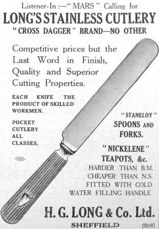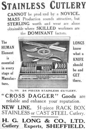Long’s seems to have struggled and Joseph Allen took sole control. In 1911, H. G. Long was liquidated and restructured by Allen with £10,000 capital. It occupied a portion of Hallamshire Works until the end of 1912, but in the following year it relocated to New Hallamshire Works, Boston Street. This was a two-storey building, with several separate workshops. Long’s had acquired additional trade marks: John Baker’s ‘MERIT’ and Horrabin’s ‘PHOENIX’. Long’s continued to produce table cutlery and pocket-knives. During the First World War, it undertook government orders for Navy spike knives and tools. Joseph Allen died in 1917, but Long’s remained under the Allen family. Thomas G. Rowland was still works manager, with his brothers Joseph and Willie also employed at Boston Street. In 1922, an explosion and fire caused by the xylonite used for knife handles seriously burned the face and hands of Joseph Rowland (Sheffield Daily Independent, 21 June 1922). At this time, the firm advertised in the trade press its ‘Cross Dagger’ cutlery, which included table knives (now in stainless steel), forks and spoons, cased canteens, and pocket knives.
