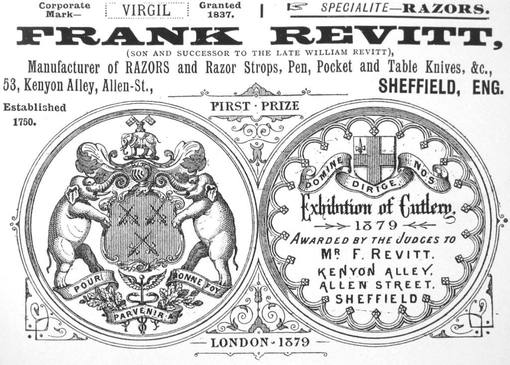 In the early nineteenth century, the Revet family moved to Netherthorpe, Sheffield. By 1825, William Revitt had opened for business in Meadow Street, making razors, pen, pocket, and table knives, and razor strops. He used the ‘VIRGIL’ mark and his razors were made of Damascus steel ‘of superior quality’. By 1833, William Revitt Jun. had joined the enterprise, living in Meadow Street, and seems to have taken over the ‘VIRGIL’ mark in 1837. The firm advertised in 1839.