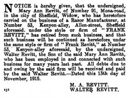 Frank Revitt, razor manufacturer, Spring Hill, Crookesmoor, died on 17 June 1889, aged 47, after ‘a short and painful illness’. His remains lie in the General Cemetery. He left £1,796. His widow, Mary Ann Revitt, Mona Road, continued to trade until 1915, when she retired. She died on 20 October 1923, leaving £2,380. Her son, Walter Revitt (1876-1960), continued the business until the 1930s.