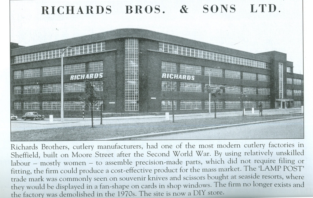In the war, the Richartzs were interned; so, too, was Muller, though he was released in 1940 to organise Richards Bros’ switchover to spanners, bayonets, and military knives. Its factories in Broomhall Street and Soho Street were damaged in the blitz. In 1945, the owners incorporated the business as Richards Bros & Sons (1946) Ltd. They built a new factory on a redevelopment site bounded by Moore Street, Charter Row, and Fitzwilliam Gate. ‘When completed, the building ... was easily the largest, most modern and best-equipped cutlery factory in Sheffield, possibly the world’ (Taylor, 19902). In 1947, £125,000 preference and £130,000 ordinary shares were offered to the public.