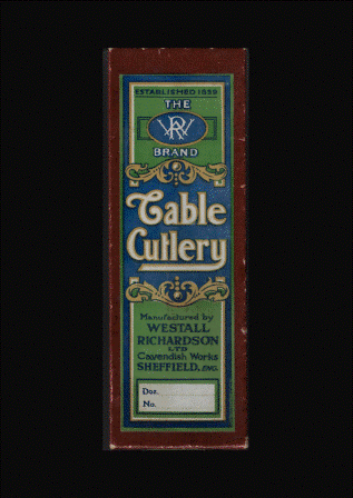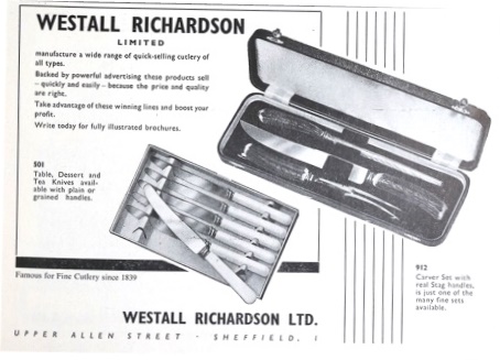 After the War, Westall Richardson Ltd continued to manufacture and advertise a wide range of table cutlery, kitchen knives, and butchers’ and cooks’ knives. The trade mark was ‘PEEREDGE’. The firm remained in family hands until the start of the 1950s, when Westall retired. He lived at Canterbury Avenue, Fulwood, and died on 21 June 1957, aged 75. He left £26,614. Richard C. V. Ellis also appears to have retired at about this time. He died on 28 August 1979, leaving £52,088. According to John Price (of Arthur Price), the firm’s reputation owed much to Harry Gregory – a cutlery maker, engineer, and manager, who became ‘something of a legend’ at the firm (Price, 19971). By the end of the 1950s, Westall Richardson Ltd was owned by American interests and had moved to Regent Cutlery Works, Upper Allen Street. It later became Richardson Sheffield Ltd.