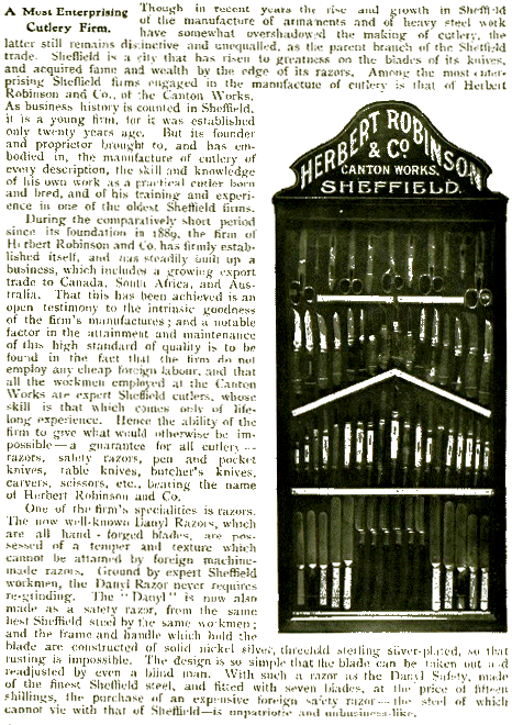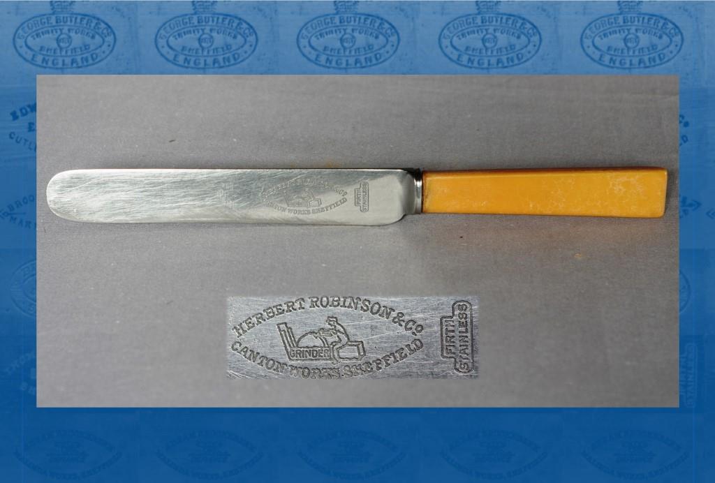 This cutlery manufacturer was born in Sheffield in 1868, the son of Charles Robinson, a pocket-blade grinder, and his wife, Ann. They lived in the Park district. Herbert worked as a pen and pocket-blade forger, until he started his own business. He may have been involved in Robinson, Marples & Co (with Alfred and William Marples). This firm was at Marson Works, Mary Street, and was dissolved in 1899. By 1900, Mary Street was the location of Herbert Robinson & Co. By 1910, Matilda Street was the address. In 1917, Robinson’s was located at Canton Works in Young Street.