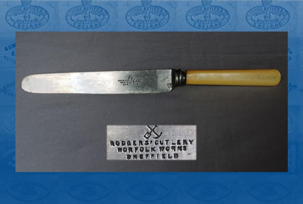 The ‘R’ denotes Rhoda, who inherited the enterprise after the death in 1860 of her husband, C. W. Rodgers. According to the Census (1861), the firm employed about 20 men. Rhoda’s 16-year-old son, Joseph, lived with her in Birley Street as a ‘manufacturer’s clerk’. He became partner in 1865. After about 1870, Rhoda began describing the Lambert Street workshops as Norfolk Works – the factory name of the illustrious Joseph Rodgers & Sons. The latter applied for a restraining order, but the case was dismissed in 1874. The judge ruled that Joseph Rodgers had been tardy in taking action over a trivial problem (Sheffield Independent, 4, 29 July 1874).
