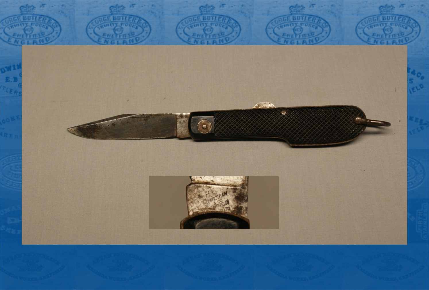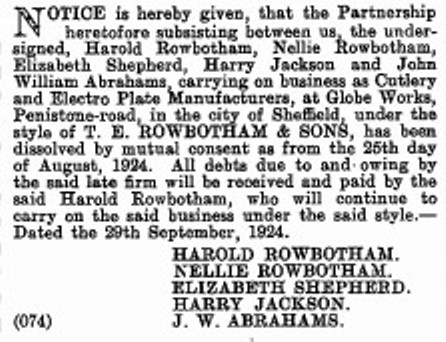 This firm can be traced to T. E. Rowbotham & Son, cutlery manufacturers, Globe Works, Penistone Road. Thomas Edward Rowbotham (c.1857-1922) was a Wadsley-born spring knife cutler, who by 1881 was working and living in Hill Foot, Sheffield. He married Annie Millicent and they had a son named Harold Rowbotham, who was born on 5 February 1894. T. E. Rowbotham & Son was listed in 1919, but when Thomas died ownership of the firm passed to Harold and his sisters, Lizzie and Nellie. This arrangement (which also included Harry Jackson and J.W. Abrahams) was dissolved in 1924. T. E. Rowbotham then disappeared from directories, but Harold continued to trade.