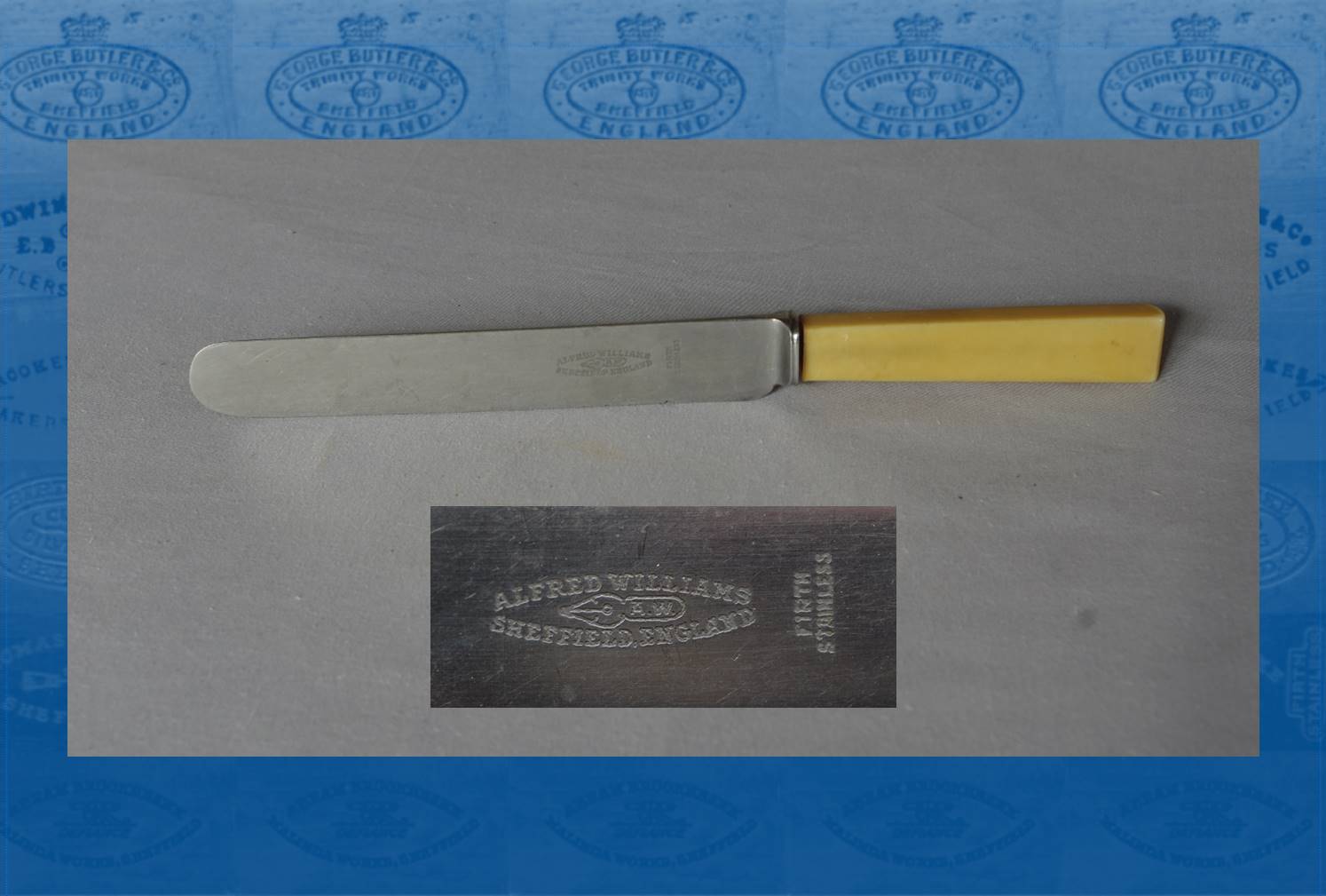 By 1913, Williams had an interest in W. & S. Butcher in Arundel Street, with Charles Leslie Butcher and Sigmund Kastor as partners. After the war – when Williams was based in Eyre Street and 39 Arundel Street – the connection was revived. ‘Alfred Williams’ became a common US import brand, especially on Bowie knives. These had the Alfred Williams’ name and the ‘EBRO’ mark of Kastor. In 1925, Williams’ business and his own mark (a pen nib, enclosing his initials) were acquired by Durham-Duplex, but he remained a director of that company and Butcher until the end of the Second World War. Alfred Williams, Rundle Road, died on 11 December 1946. He left £15,151.