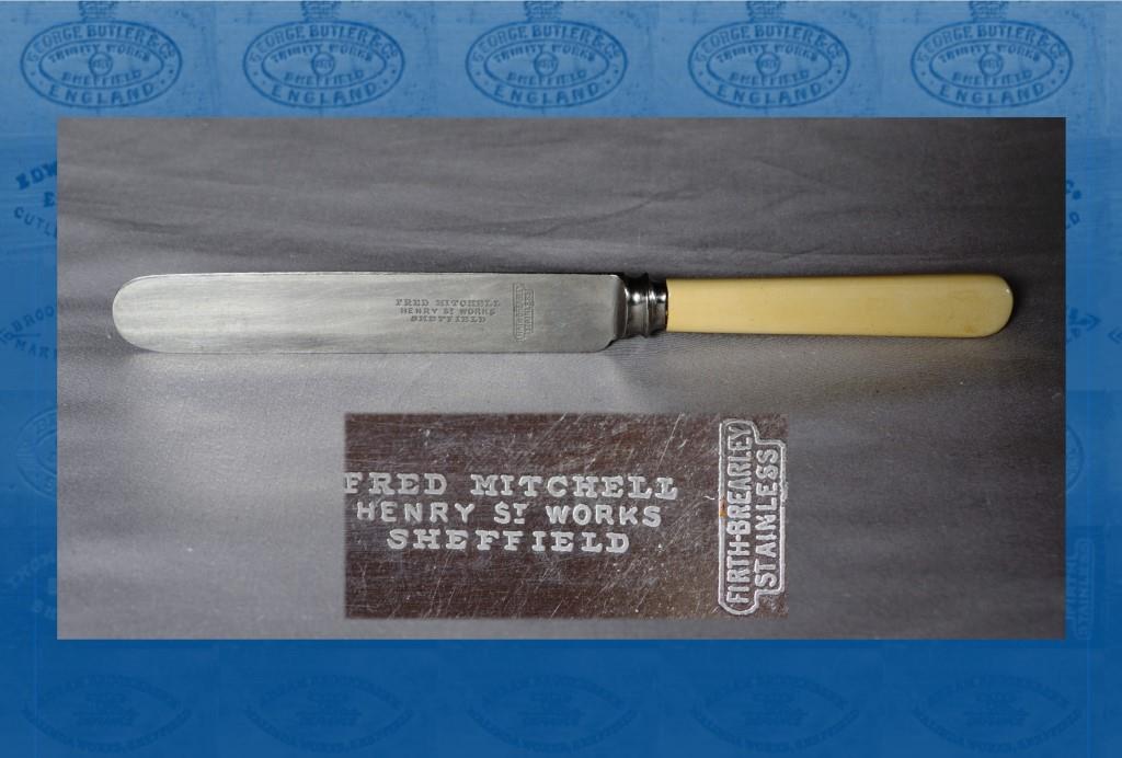 The Hawley Collection knife is marked Henry Street Works, which at that time was up for sale in Sheffield at a knock-down price. The Works would soon be occupied by Edwin H. Needham, a table cutlery manufacturer. Presumably, Mitchell’s knives would be ‘bought in’ from such a maker. Fred Mitchell seems to have ceased trading from his cutlery stall in the early 1930s and his subsequent career is untraced. ‘Fred Mitchell’ is a relatively common name and it has so far proved difficult to identify him.