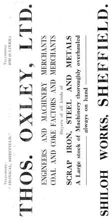 In 1931, Thomas Oxley (1923) Ltd merged with Oxley & Co (Machinery) Ltd, iron, steel and scrap merchants in Savile Street. Oxley’s also acquired the local coal and coke business of Brooks, Haywood & Co. This was said to have raised it to a leading position in the coal trade in the north. ‘Coke for industrial use is one of their specialities’, noted The Sheffield Daily Telegraph, 26 September 1931. In 1939, Oxley’s relocated to Wicker Arches House, after the Corporation had acquired Shiloh Works. During the War, the firm’s address was Halifax Buildings, Pinstone Street, but by the 1950s it was no longer listed in directories (though Maurice Oxley Ltd was listed as a coal merchant at Exchange Buildings).