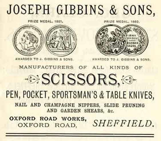 Gibbins was one of the best Sheffield scissors makers of its day. The family came from Darnall. The founder was Joseph Gibbins, who in the Census (1841) was a scissor smith, living on the Worksop Road with his wife, Ann, and their family (which included sons Henry, Joseph, and Samuel – the first of whom was a scissor smith). Living in Worksop Road was another son, John Gibbins, who was a scissors forger. In the directory of 1845 Joseph Gibbins & Sons was listed as a scissors and shears manufacturer in Cricket Inn Road – at the end of Broad Street, Park. The enterprise won a Prize Medal at the Great Exhibition (1851), when it displayed a 19-inch (47cm) pair of scissors, worked with small files and drills, and with the motto ‘Unity and Peace’ [of England, France and America] round a portion of the bows in cipher letters. The business was listed as a manufacturer of scissors, shears, nippers, snuffers, and corkscrews, and was operated by Joseph and Samuel Gibbins, based in Cricket Inn Road. It employed about 25 workers. Other members of the Gibbins’ family – Joseph Jun. at Hyde Park, John at Darnall, and Henry in Suffolk Road – had joined the business. Joseph’s daughter, Frances, married Thomas Rudd.