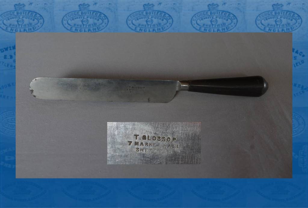 By 1860, Albert was listed in directories as a horn presser in Sylvester Lane; then later in Cambridge Street. In 1881, he employed four men. Thomas had followed him into the trade and by 1881 had a workforce of five men and two boys at St Mary’s Road. By 1900, he was listed at St Mary’s Road as a razor scale manufacturer and horn and waste dealer; but after 1897, he also operated a retail outlet in Norfolk Market Hall. By 1905, besides this shop, Thomas had moved from St Mary’s Road to a small factory in Harmer Lane. His home was Pattsybrooke, Brinkburn Vale Road, in Totley. Albert Glossop, Causeway Head Farm, died on 23 March 1909, aged 82, and was buried in the General Cemetery.