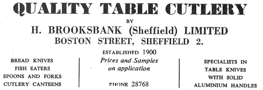 In the previous year, H. Brooksbank (Sheffield) Ltd had been incorporated, with £5,000 capital, and with the Brooksbank family as directors: Herbert and his wife Rose Hannah (1873-1960), besides their sons Harry Leslie (1902-1999), Thomas Alfred (1916-1992), and Harold (1918-2005). In 1955, the company advertised as a manufacturer of ‘quality table cutlery’ from Boston Street (Brucut Works). According to Herbert Housley (personal communication, 23 May 2013), their speciality remained ‘cheap aluminium handle knives, [which] were cast on using single moulds and whittle tang (sheet steel) blades and afterwards drop stamped. Reed and Shield was a popular design. These knives were extensively used in the catering trade before the advent of cheap imported stainless steel cutlery’. The firm apparently ceased trading in the 1980s (and was acquired by K. Bright). It was dissolved in 1995.