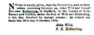 The earliest mention of Samuel in Sheffield was in 1818, when a partnership manufacturing table knives with Jared Yates was dissolved. He next joined John Wild (possibly the cutler and publican at Pond Hill). Wild & Kebberling was listed at Pinstone Street as a factor and manufacturer of table knives, razors, and scissors. They parted in 1824, though Samuel continued to trade at Pinstone Street. He made his last appearance as a factor and manufacturer in a Sheffield directory in 1828. In 1833, John Kebberling, gent., was listed as living at West Street. However, John Conrad had died on 4 November 1832, aged 80. He was described as a man of ‘strictest integrity and uprightness’ (Sheffield Independent, 10 November 1832). His burial has not been traced, but he left a will. It made due allowance for his wife, Sophia, and also left an annuity of £30 to Samuel for life. In the Census (1841), Samuel (a warehouseman at Nursery Street) was residing in West Street at the house of John Bembridge, a painter. The latter’s wife was Maria (c.1791-1859), who was Samuel’s sister and had been born in London. She had married John Bembridge in 1817. They had a son, James Kebberling Bembridge, who became senior partner of Hawksworth, Eyre.
