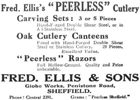 In 1916, Fred Ellis and his sons – William Frederick and John – launched Fred Ellis & Sons at Globe Works. It advertised cutlery trademarked ‘PEERLESS’ in 1921. However, it was bankrupt in 1924. The partners blamed a business slump for liabilities of £4,617, against assets of £1,332 (Sheffield Daily Telegraph, 21 March 1924). Fred Ellis’s ‘successor’ was A. E. Ellis & Co.