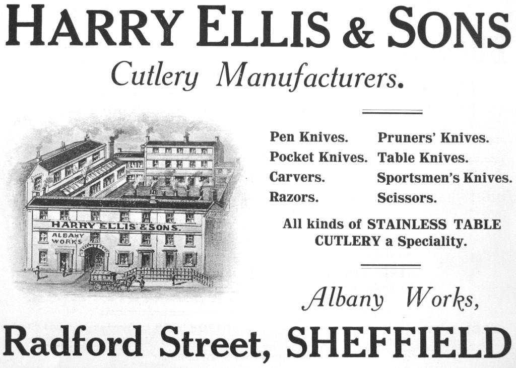 Harry Ellis & Sons was based at Albany Works, Radford Street. The firm advertised in a trademark directory (Whitham & Vickers, 1919). Harry Ellis’s offered the usual range of Sheffield cutlery, including stainless table knives. Harry Ellis died on 27 February 1922, leaving £7,649. The firm ceased trading.