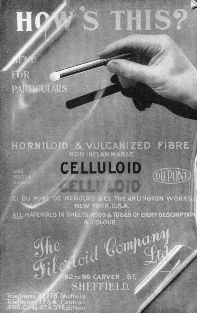 Fiberloid was registered in Sheffield as a private limited company in 1908, with £5,000 capital. It was designated as a cutlers and silversmiths and dealers in celloloid, xylonite, vulcanised fibre, ivory, and horn. Essentially, it manufactured and marketed cutlery handle materials, especially man-made substitutes such as celluloid. The new company acquired the rights from Fiberloid Co of New York to manufacture ‘grained ivory’ and ‘creamed ivory’. This was a response by the directors to the rising cost and predicted ‘gradual famine’ of African ivory (Sheffield Daily Telegraph, 2 May 1913).