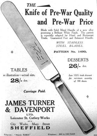 Turner agreed and they traded first as ‘James Turner’, City Works, Mary Street. Neither partner settled the terms of their partnership and it seems to have remained informal, though Turner’s shareholding was greater. In 1920, James Turner & Davenport Ltd was registered by Turner and Robertson as a private limited company with £20,000 capital. Robertson held 3,500 fully-paid £1 shares; Turner 4,500 fully-paid £1 shares. A total of £15,000 was subscribed and £3,000 debentures were issued. The address was Leicester Street Cutlery Works, 33 Leicester Street, and City Works, Mary Street. The firm sold (using Turner’s trade mark ‘MAJESTIC’) wholesale stainless table cutlery, carving sets, canteens of cutlery, safety razors, and even a few tools. The firm had offices at West Bromwich and Coleman Street, London.
