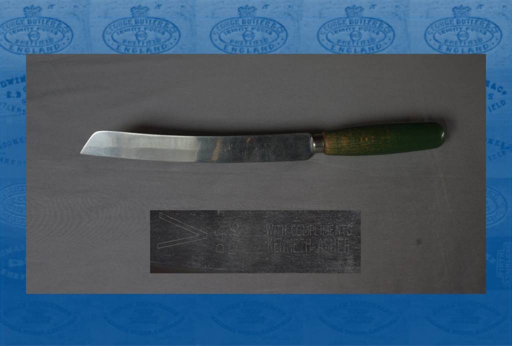 The knife that we have appears to have been a complimentary gift from Kenneth Asher to celebrate the end of World War 2. Ken was a well known Sheffield butcher, shopkeeper and slaughterman who had a shop on Herries Road along with stalls in the Sheffield meat & fish market and also the abattoir. Ken was the son of Archie Asher, also a shopkeeper & butcher, who had a shop at 161 Upwell Street (1939).