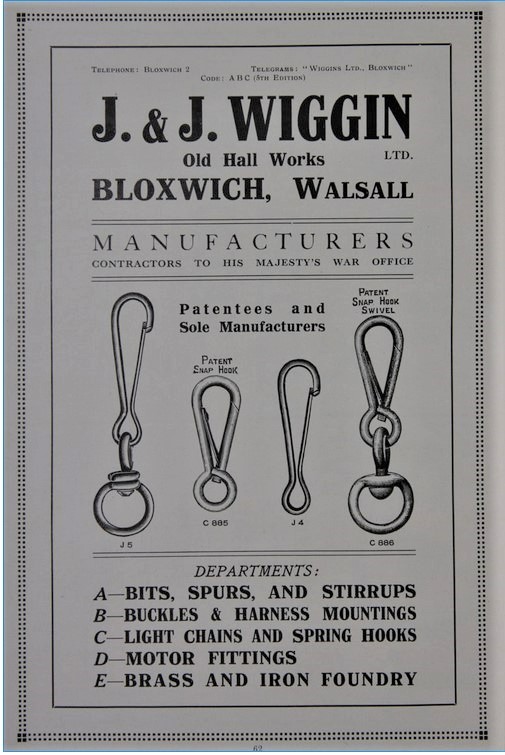 The business was started in 1893 by James Thomas Wiggin and James Enoch Wiggin in stables at the rear of the family home. By 1904 this had became too small and they moved to the local Salvation Army Mission on Revival Street, Bloxwich, the Mission was known locally as 'The Old Hall' and this name was to become their registered trade mark. An advertisement dated 1916 lists the company activities in five categories :- 1) Bits, spurs, stirrups; 2) Buckles & Harness Mountings; 3) Light Chains & Spring Hooks; 4) Motor Fittings and 5) Brass & Iron Foundry and also as a contactor to the War Office. The product range saw a significant change during World War 1, the 1918 Directory of Manufacturing in Engineering and Allied Trades listed the companies 'War Work' to include 18 pound shrapnel shells, 6 inch howitzer chains & eyelets, aeroplane turn buckles, grenade split pins & rings and metal castings, employing 90 male and 200 female workers.