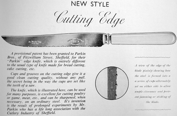 Parkin Bros advertised as makers of ‘IBEX’ brand and ‘PARKIN EDGE’ kitchen knives (International Cutler, December 1952). These knives had cups and grooves along the cutting edge to facilitate (it was claimed) the cutting of bread, poultry, and game. The design had echoes of ‘Granton Edge’ knives made by William Grant. Cyril Parkin, of Bishop’s Court, Sheffield, died on 6 December 1967. He left £4,094. Parkin Bros had traded into the 1960s, but was not listed in 1968.