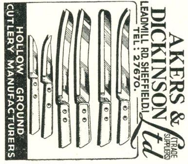 This firm was incorporated in 1948, with £30,000 capital and four partners: Harry Akers (1900-1975), his wife Constance Annie Akers (1904-1987) , Edward Vincent Dickinson (1903-1971), and his wife Violet Hilda Dickinson (1902-1979). It was listed in 1951 in Leadmill Road as ‘hollow ground cutlery manufacturers’. It supplied the trade with carving and kitchen cutlery. Whitham & Sykes (1953) listed ‘three queens and device’ as the trade mark. In 1957, the address was Furnival Lane. In 1964, Harry Akers and E.V. Dickinson registered a patent for carving fork guards and fork rests (GB966321A) using the Furnival Lane address.