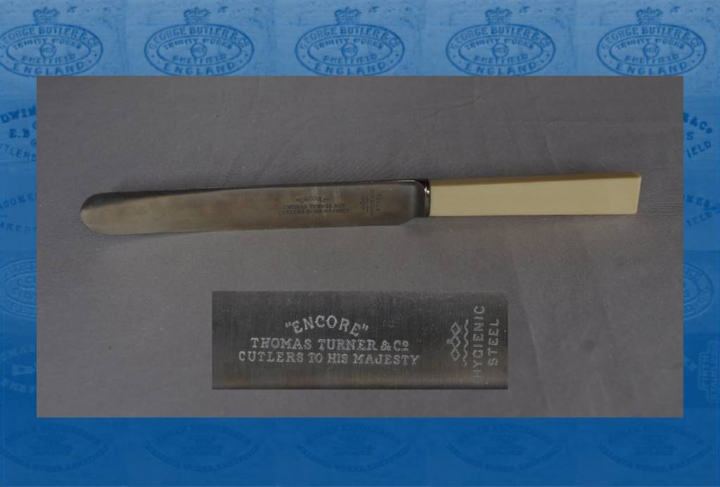 Advertisements described the firm as a manufacturer of table knives and forks, and silver and plated desserts, fish carvers, and butter knives. Turner’s had registered a silver mark in 1865; and another in 1884. Suffolk Works also made (or factored) pen and pocket knives, gardeners’ knives, and razors, saws, files, edge tools, and steel. Table knives remained an important commodity. The ‘Wellington Knife’ was replaced by the ‘Suffolk Knife’. This registered knife had echoes of the Brownill patent, with a tang running the length of the handle, and an internal ‘lock’ pin and an oval rivet on the end (Pawson & Brailsford Illustrated Guide, 1879). Turner’s cutlery and tools carried a trade mark with three horizontal diamonds. This mark later appeared with the word ‘ENCORE’ (‘granted in 1805’ and once used by Jonathan Hunt).