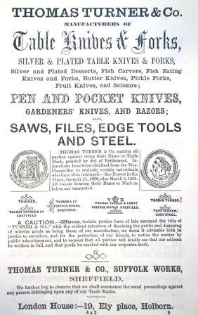 The founder was Thomas Turner (c.1784-1845); the establishment date was 1802 (according to the company). By 1816, Thomas was apparently the ‘Turner’ in Thorpe, Turner & Co, merchant, Orchard Street. His partner was William Thorpe; later John Brownill joined them. In 1821, Brownell [sic], Thorpe, Turner & Co was listed at Hollis Croft and Orchard Street as a manufacturer of Brownell’s patent knives and forks. Turner seems to have then decided to go-it-alone. In 1825, Thomas Turner & Co was listed in a directory as merchant and manufacturer of table and pocket knives, files, tools, and steel refiner at Norfolk Street. By the early 1830s, Turner had relocated to Eyre Lane, where he was joined by John Yeomans and Jared Yates. In 1835, Turner, Yeomans & Yates was disbanded. Turner’s next partnered Christopher and Henry Johnson (presumably Christopher Johnson). Turner & Johnsons operated from Suffolk Works, Suffolk Road. This lasted until 1837, when White’s Sheffield Directory listed Thos. Turner, & Co at that address as a merchant, steel refiner, and cutlery, saw, file, and edge tool manufacturer.