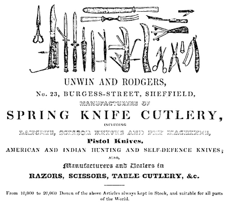 Under Philip Unwin, the firm expanded with the burgeoning American trade. By the end of the 1830s, Unwin & Rodgers was marketing ‘Self-Defence Knives’ – in other words, the type of knives beloved by the American frontiersman, such as lock and sneck knives, daggers, and dirks. The firm was one of the earliest manufacturers of Bowie knives. It also advertised ‘Indian Hunting’ knives, though whether these were for hunting Indians, or for Indians hunting, was not made clear!